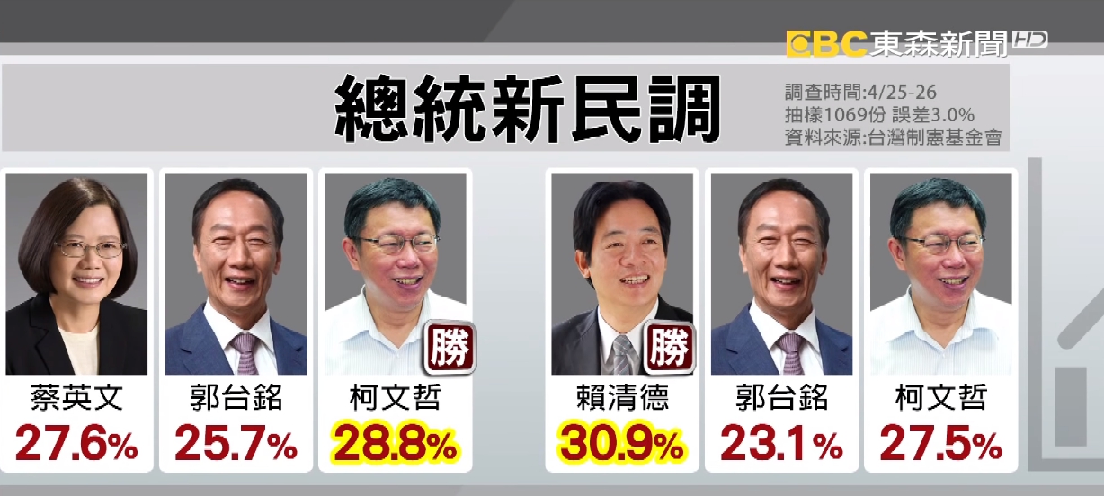 台灣民意制憲基金會今(3)日上午公布2020總統大選最新民調,藍綠白三腳督,國民黨推派韓國瑜對陣民進黨的蔡英文與賴清德以及柯文哲,結果顯示,韓國瑜以3成4以上的支持度贏過蔡英文賴清德和柯文哲,而這份民調與TVBS民調中心最近所做的民調結果相似,韓國瑜依舊維持高人氣。