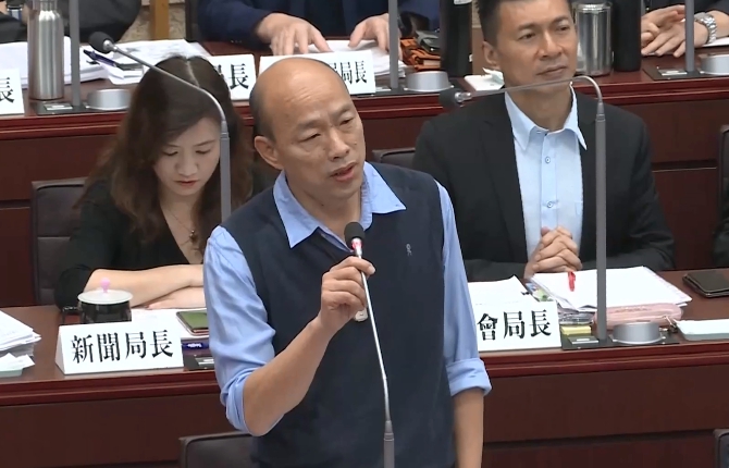 國民黨高雄市議員黃紹庭:「韓國瑜市長要回答的時候,就請他坐下,再下一題,那如果說市長說這個東西,我們有具體的,我們請局長來代為回答的時候,她又說要局長回答那不用,那你坐下,韓國瑜市長就在那邊站起來,坐下,站起來,坐下,一共18次。」