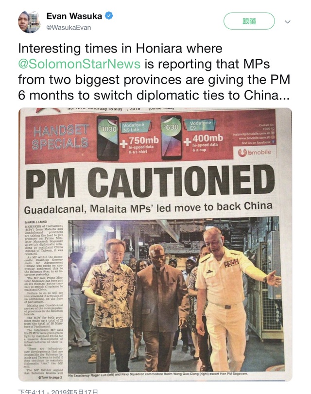 澳洲廣播電台駐索羅門群島的記者Evan Wasuka在17日發推特,轉發索羅門媒體報紙頭版,Evan Wasuka指出有兩位最大省份國會議員要求總理蘇嘉瓦瑞(Manasseh Sogavare)在6個月內和中國建交。且報紙頭版還以「PM CAUTIONED總理注意」為題。Evan Wasuka還評論「非常有趣的時間點」。我國外交部今日表示,索羅門國會支持與台灣邦交者仍占多數,加上內閣數多黨聯盟,部份國會議員主張與中國建交,仍難形成共識或政策。索羅門當地媒體日前也引述不具名人士報導,索國要求台灣增加對索羅門的援助款,否則將轉與北京建交。