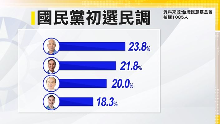 不只網路各自解讀,民調也是見人見智,像是這份台灣民意基金會最新數據,第一名是韓國瑜支持度23.8%,但第二是郭台銘的21.8%,而朱立倫18.3%只有第四名,難怪講話有些酸酸的。