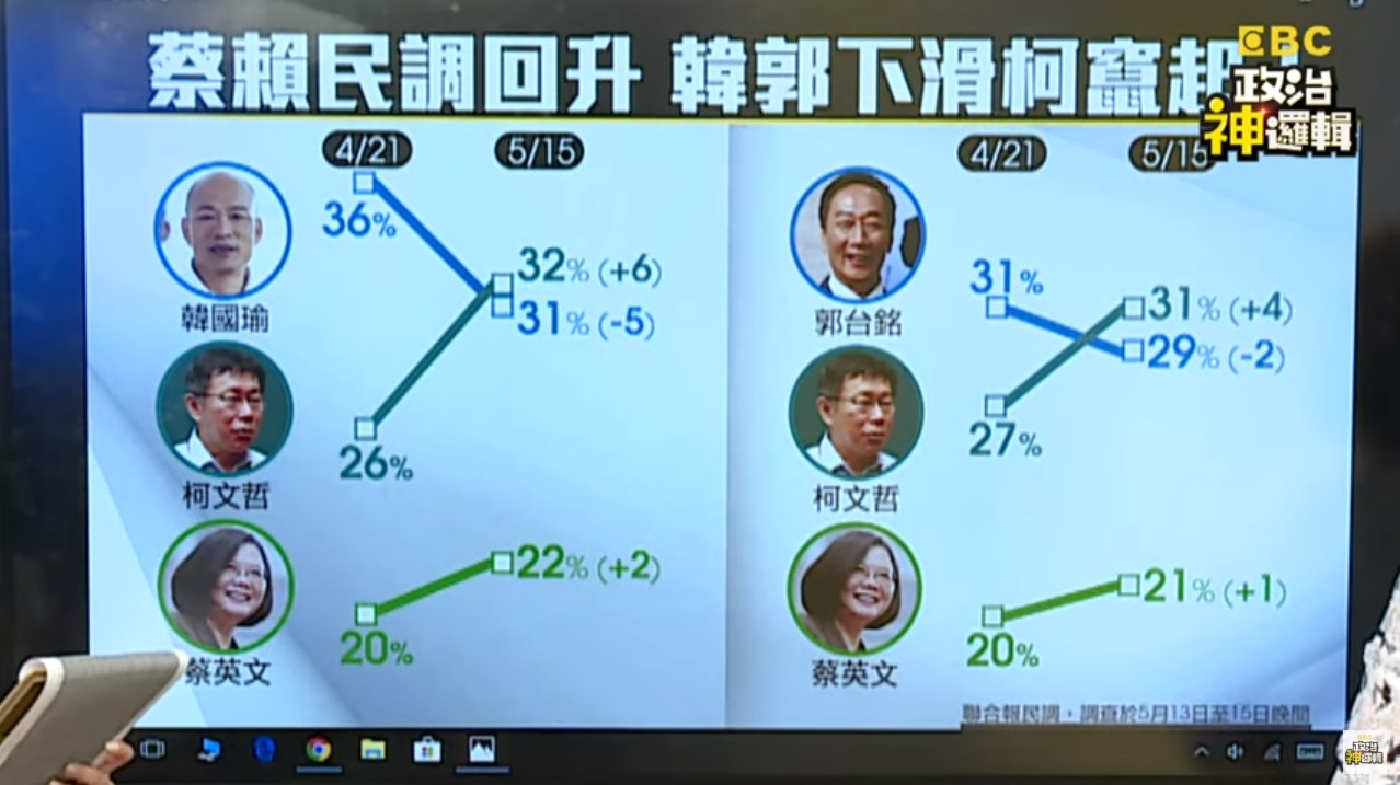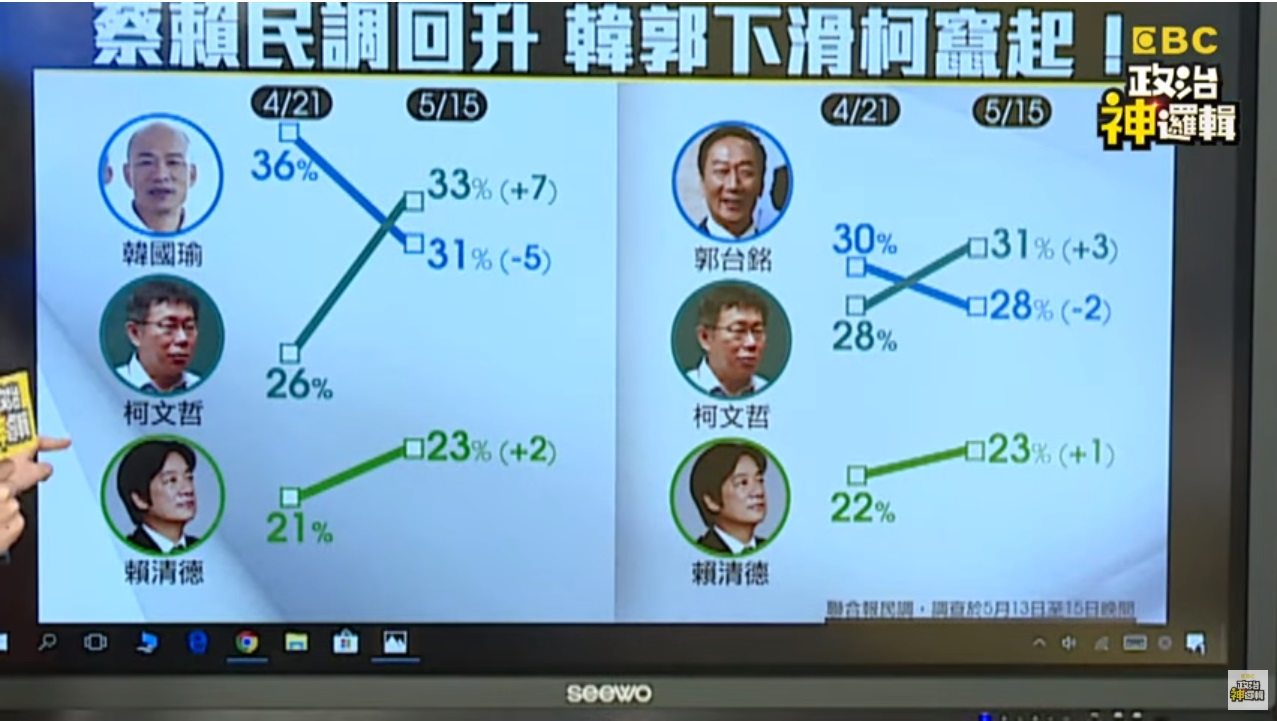 宅神朱學恒在節目中認為,聯合報這份民調中高雄市長韓國瑜支持度跌5%,已經來到誤差範圍的極限,相當接近真實衰退,而柯文哲因「專心沒讓市政擴散成危機」,讓支持度提升。洪孟楷也坦言,藍營看到這份民調確實「怵目驚心、膽顫心驚」!也認為黨內一定要「自我反省」,因為這份民調,是柯文哲首度在藍綠白局面中,無論藍綠派誰出線都獲得領先。