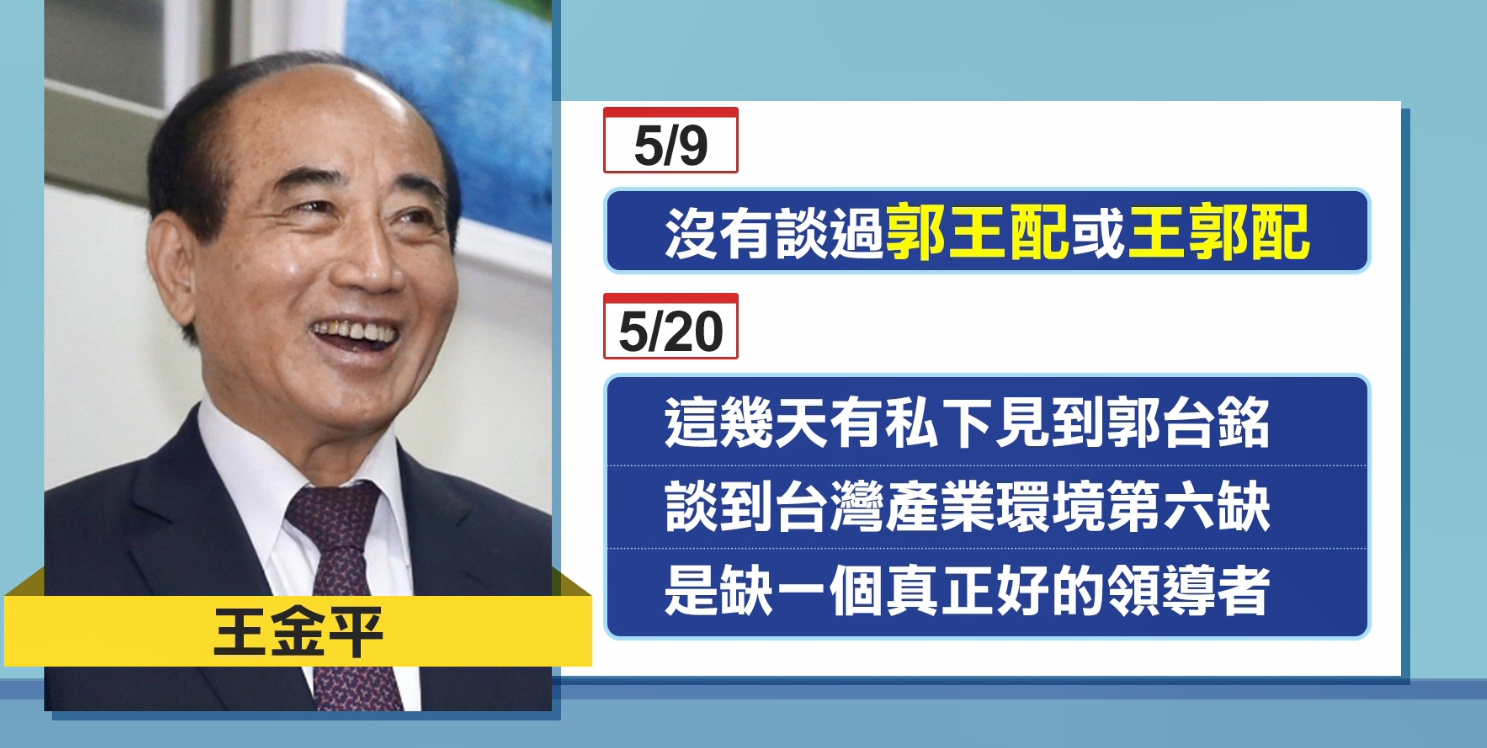 東森新聞獨家訪問郭台銘,他強調現階段還是以個人發展優先,但回顧王金平近期發言,5/9時他否認有談過「郭王配」或「王郭配」,此時還是兄弟登山,各自努力的氛圍,然而5/20,王金平卻透露有和郭台銘見面,聊到台灣產業不只5缺,第6缺是一個真正好的領導者,這句話也是郭台銘最近公開演說的台詞,看來雙方已在會面中,取得一些共識。