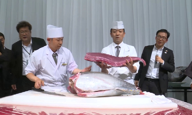 40公斤重的大鮪魚,日本師傅現剖現切,柯文哲目不轉睛看不停。