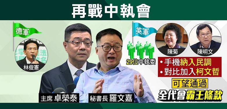 卓榮泰上週擋住中執會的表決,這週成員差不多,比例依舊相當懸殊,估計挺英派主張修正的辦法,手機納入民調,對比加入柯文哲都會通過,「英軍」甚至還有七月的「霸王條款」可用。