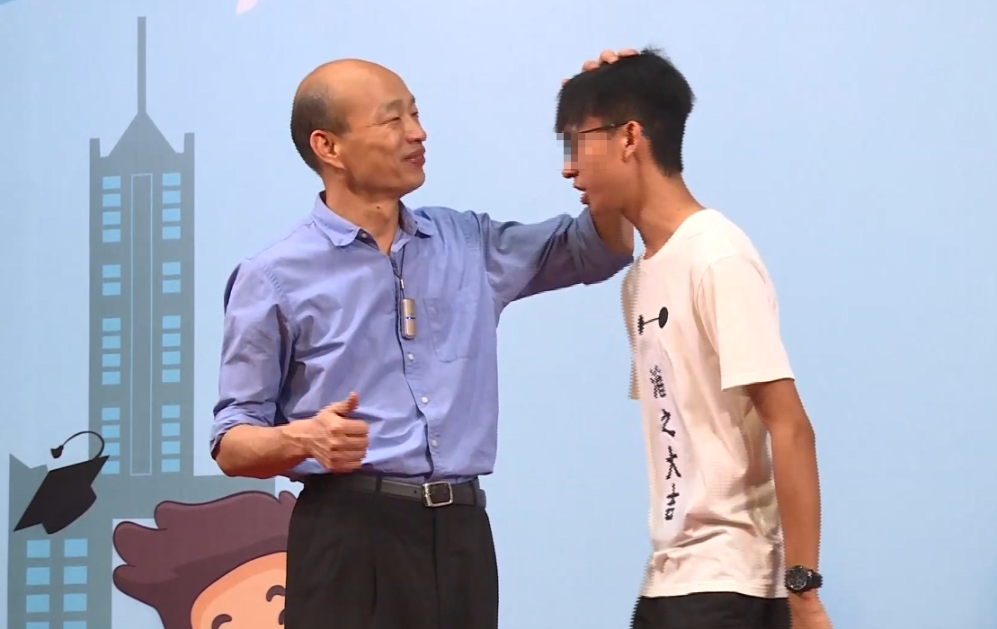 黃姓高中生穿溜之大吉衣,表達對韓國瑜要選總統不滿,韓國瑜在台上臉上笑笑,與學生合照完,還摸了摸他的頭,除了黃姓高中生,還有一名國小女生,雖然在台上跟市長抱抱,但也寫紙條給韓國瑜,希望市長專心市政。
