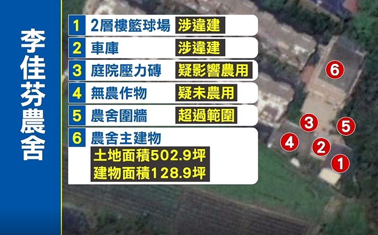 從韓國瑜夫妻提供的財產申報,再比對地籍資料,李佳芬名下這棟農舍在2000年完工,取得使用執照後,就繼續擴建,但建築面積不得超過農地10%,現在有2層樓的籃球場,車庫還蓋了圍牆加主建物,又沒看到農作物,涉及違建也超過範圍。