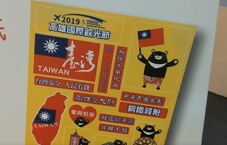 工作人員強力推銷,買「好玩卡」就送旅遊手冊,還獨家贈送貼紙,仔細看這貼紙上頭竟然可以看到,「非韓不投 韓國瑜凍蒜,鋼鐵韓粉」等等的選舉標語,連同設立在捷運站裡頭的大型背板都寫著韓國瑜的標準口號,「台灣安全,人民有錢」這八個字,有議員質疑這根本違反了行政中立。