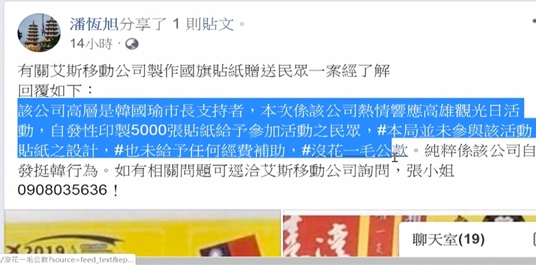 質疑高雄市政府根本就是利用行政資源在幫韓國瑜進行造勢,要捷運局、觀光局出面把話說清楚,觀光局長潘恆旭在臉書上回嗆,這間公司高層是韓國瑜市長的支持者,自發性印製五千張貼紙來贈送給大家,市府並沒有參予貼紙設計,更沒出一毛公款,撇清關係。