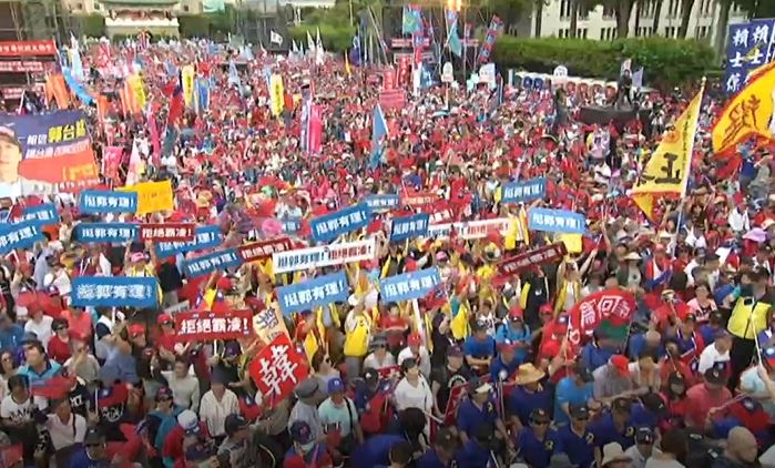 笑看韓郭隔空喊話,而前一天凱道造勢,郭台銘台上要送粉紅國旗帽 ,給蔡英文過境美國戴,隔天再加碼稱可以親自送到機場。