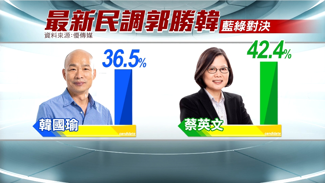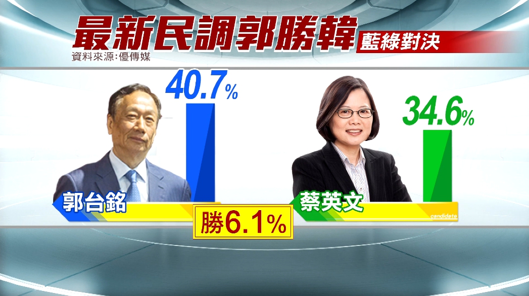 根據「優傳媒」公布的最新民調,郭台銘與韓國瑜出現黃金交叉,郭台銘在各種可能的對戰組合中,都勝過蔡英文和柯文哲,但在藍綠對決狀況下,韓國瑜會輸給蔡英文5.9個百分點。