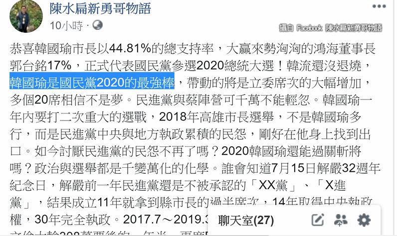 ▼前總統陳水扁曾說,韓國瑜是國民黨2020最強棒。(圖/翻攝自臉書陳水扁新勇哥物語)