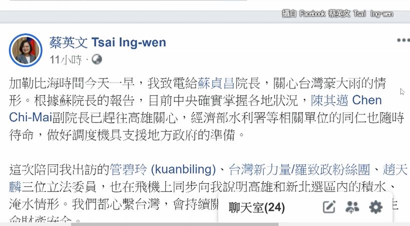 ▼蔡總統在臉書宣布,請蘇貞昌和陳其邁關心災情。(圖/翻攝自蔡英文 Tsai Ing-wen臉書)
