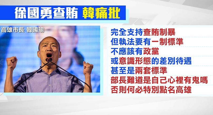 除了陳其邁之外,內政部長徐國勇,最近到高雄市警局查賄選情況,引發跟韓國瑜的口水戰,韓國瑜質疑徐國勇動機不單純,韓國瑜說,完全支持查賄制暴,但執法要有「一致標準」,不應該有政黨,或意識形態的差別待遇,甚至是兩套標準,部長難道是自己心裡有鬼嗎?否則何必特別點名高雄。