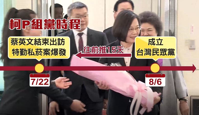 柯文哲8月6日籌組「台灣民眾黨」。柯文哲的親信蔡壁如表示,早在七月下旬就已經去內政部登記,時間剛好就是蔡英文總統出訪回國,爆發私菸案那一天。而柯P組的政黨定位為「柔性政黨」,只要認同其理念的公民,都可以登記參加初選。