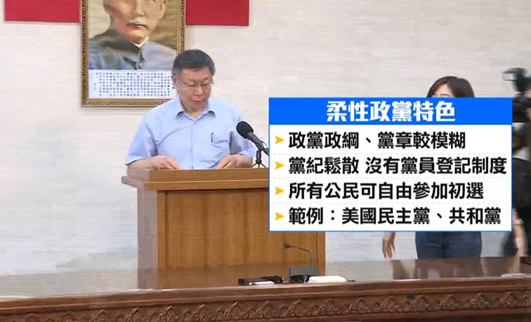 柯P要組的台灣民眾黨定位為「柔性政黨」,也就是政黨政綱與黨章較為模糊,沒有黨員登記制度,沒有固定的黨員,只要認同其理念,所有公民都可以自由選擇參加初選,包括美國的民主黨和共和黨,都是柔性政黨。
