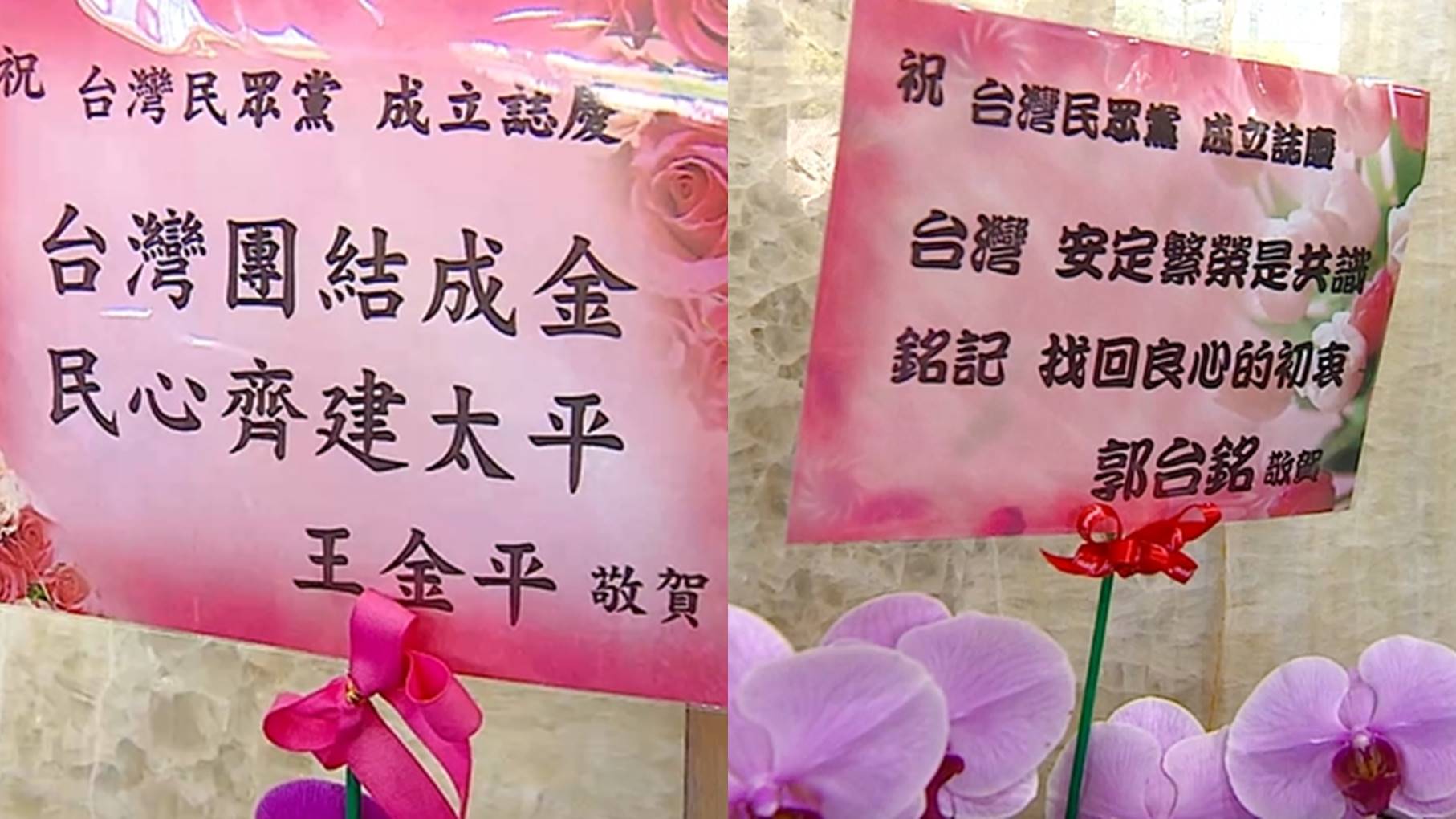 ▼柯文哲創黨當天,郭、王分別送上花籃祝福。(圖/東森新聞)