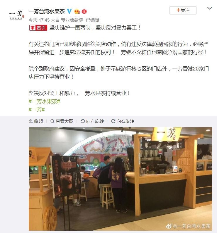 香港5日時發起三大霸,罷工、霸課、霸市的不合作運動,對此一芳水果茶,5號突然在微博發表,「堅決維護一國兩制,堅決反對暴力罷工」,引發譁然,甚至還有香港人直接在香港分店招牌上噴漆,,把「一芳」招牌變成了「共芳」。