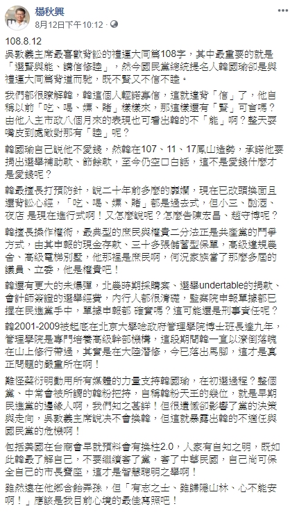 ▼楊秋興臉書全文。(圖/楊秋興臉書)