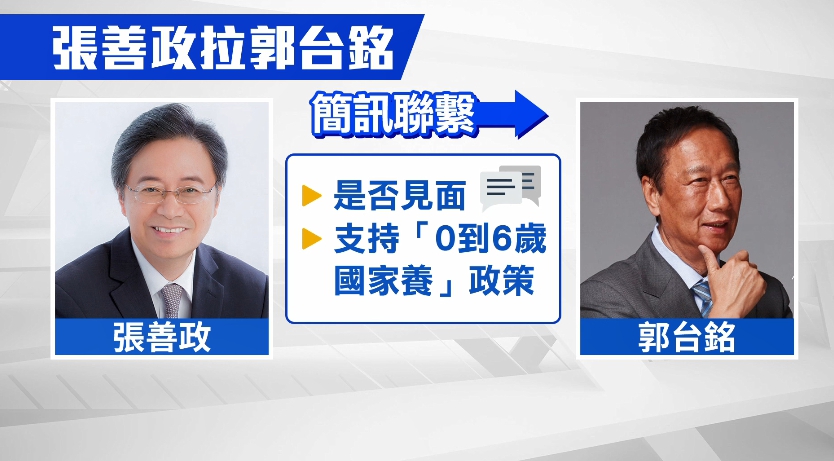 上周才正式接下韓國瑜的國策顧問團隊總召,前行政院長張善政現在也希望,能夠促成韓、郭團結,打贏選戰,張善政透露,最近有和郭台銘傳簡訊聯絡,內容講到是否要見面,以及他建議韓國瑜,應該要納入之前郭董提出的0到6歲國家養政見,盼郭台銘不要離開國民黨。