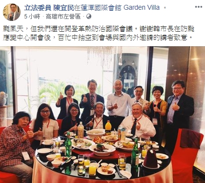 對此,立委陳宜民在下午貼出「真相」打臉,原來韓國瑜是為了向「登革熱防治國際會議」的講者們致意,才會在蓮潭會館停留大約5分鐘時間。而韓國瑜今晚8點也回到高雄防災應變中心,召開第二次防災會議。