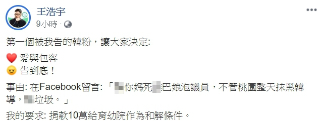 王浩宇在6月初貼出一張對話截圖並發文,一位韓粉曾在他臉書留言謾罵,先是飆了一串髒話,接著再罵他「娘泡(炮)」、「垃圾」,他決定提告,並要求對方需捐款10萬元給育幼院作為和解的條件。對方事後相當後悔,私訊王浩宇道歉,他坦言「剛出社會存款,只有3萬多元」,實在負擔不起。