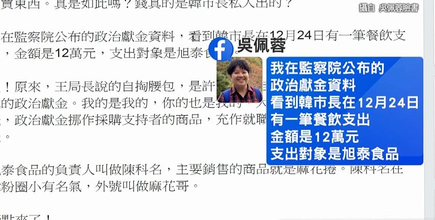 韓國瑜對弱勢家庭送暖,讓許多民眾覺得揪甘心,不過現在卻被無黨籍參選高雄立委吳佩蓉踢爆,這一切都是假的,她在臉書上寫下當時王淺秋召開記者會,說明他們在接獲陳情後,韓市長決定自掏腰包採買麻花捲,但她在監察院公布的政治獻金資料,看到韓市長在12月24號,有一筆餐飲支出,金額是12萬,對象是旭泰食品也就是麻花捲工廠,原來王淺秋說的自掏腰包,其實是政治獻金挪做,採購支持者的商品,認為觀感不佳。