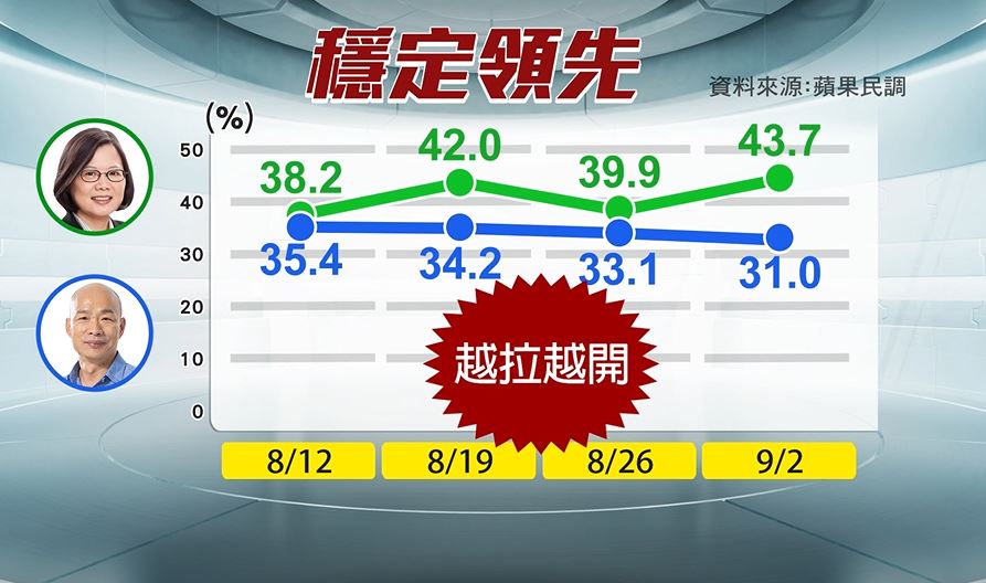 全力回擊在野人士的質疑,這也反應在數據上,根據蘋果日報民調,過去一個月,郭柯聯盟幾乎在跟蔡韓三分天下的局面,搶下第一進入九月,蔡英文翻盤了,讓郭柯組合從領先11%變持落後2.6%,有可能是因為搖擺不定支持者不耐煩。