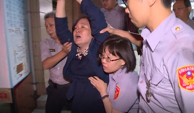 民進黨議員高敏慧被檢舉利用人頭浮報助理費,被檢調人員帶回訊問後,移送地檢署複訊,在媒體鏡頭前喊冤。