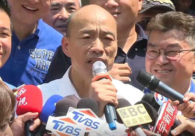 高雄市長韓國瑜:「我想郭台銘董事長可能對三重那個,整個第一場造勢大會,有一點點誤解,我是在場外等了,快將近2個小時,並沒有遲到的問題,只是馬總統,因為那天參與的人,第一場造勢太踴躍,所以使得時間耽擱,我也為了這一點,跟馬英九總統特別道歉。」