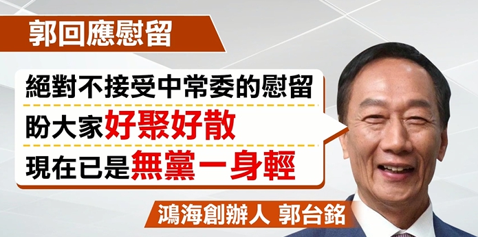 國民黨中常委一改過去批評態度,為了不讓郭台銘出走造成更大風波,黨中央中常會決議要繼續慰留郭董,說他依舊是國民黨員,希望郭台銘能不計前嫌留在國民黨。