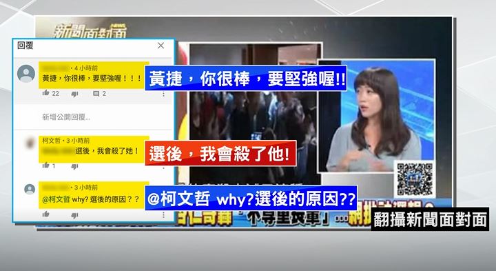 受訪時遭到韓粉嗆聲連罵12次垃圾,黃捷周日到警局提告,接著周一上政論節目,節目上傳到網路後,吸引不少網友留言,竟然還有網友說要嗆殺黃捷,看看當時留言,先是有網友稱讚黃捷你很棒要堅強喔,沒想到網友柯文哲回說,「選後,我會殺了他」,事發後黃捷行程照跑,面對嗆殺恐嚇選擇勇敢面對。