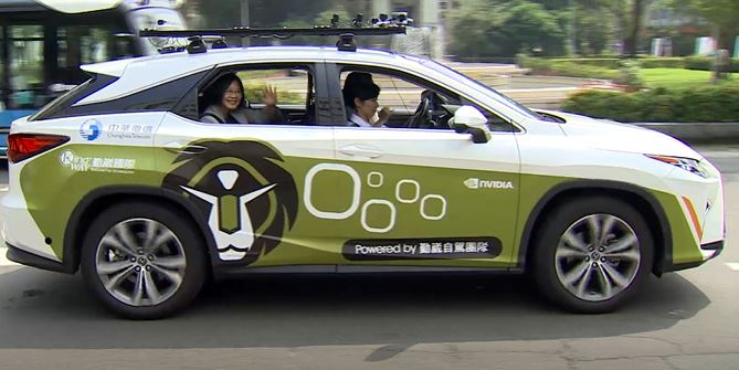 參觀5G新科技,總統當然不能錯過自駕車體驗。總統蔡英文:「我按下去,我們就要走了啟動了。」