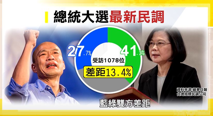 就連民進黨立委都大酸特酸韓國瑜年輕選票不斷流失,似乎也反映在民調上,根據蘋果日報公布最新調查,爭取連任的總統蔡英文,支持度有41.1%,韓國瑜支持度27.7%,藍綠雙方差距創下蘋果日報民調新高,達13.4%,而這也是韓國瑜第十度落後,讓同一戰線的國民黨立委很焦慮。