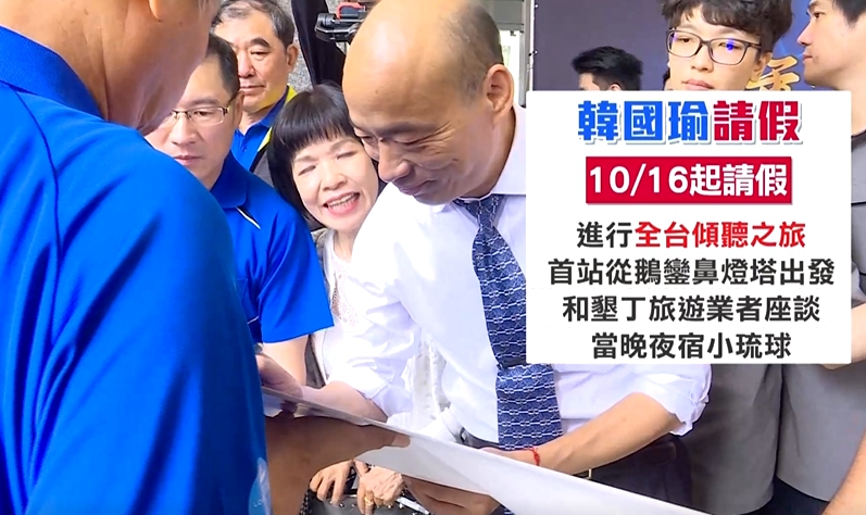 強調確定請假就會發出聲明,但現在還有消息指出,韓國瑜從16日開始就要進行全台傾聽之旅,首站從鵝鑾鼻燈塔出發和墾丁旅遊業者座談,當晚夜宿小琉球,但月底市議會最重要的明年度預算市政總質詢,韓國瑜可能會出席。
