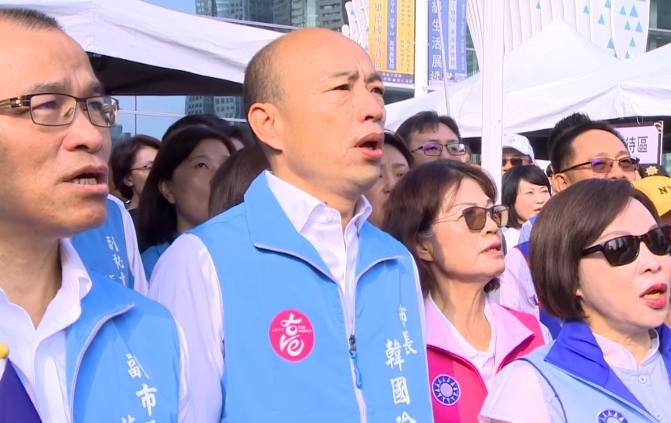 「不管從任何角度來看,中華民國都是一個了不起的國家,大家說對不對?」正當韓國瑜講到激動處時,背後的大幅國旗背板卻突然掉落,台下民眾忍不住叫出聲,幸好多名工作人員立刻上前「救援」,將背板扶正掛回去,而韓國瑜似乎太投入沒注意到身後小插曲,繼續淡定發表演說。