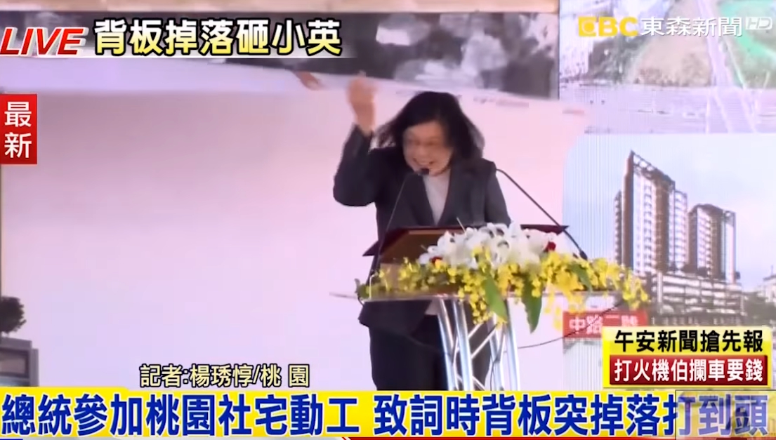 事實上,背板垮台的狀況並非首次,2016年底,總統蔡英文出席「桃園市社會住宅動土典禮」時,致詞到一半,舞台後方的背板也疑似被強風吹倒,砸到蔡英文的頭,她也錯愕地縮了一下,所幸沒有大礙,當下她也笑說「剛才小朋友表演的興奮,讓後面的紙板也興奮起來了…」事後還尷尬自嘲,「只是珍珠板、虛驚一場」。