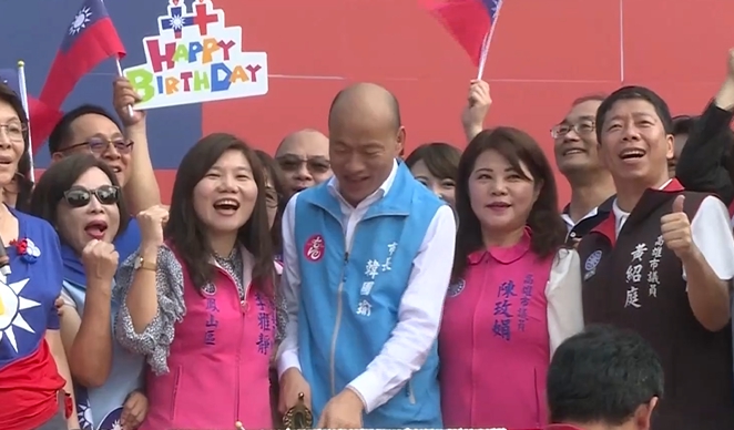高雄市長韓國瑜主持國慶升旗典禮,藍營高市立委參選人大集結展現勝選氣氛,但韓國瑜民調狂輸蔡英文超過10個百分點,被外界視為「弱勢母雞」,加上韓流在高雄退燒,就連藍營立委參選人與韓國瑜的合照看板,也變成 選戰觀察指標。