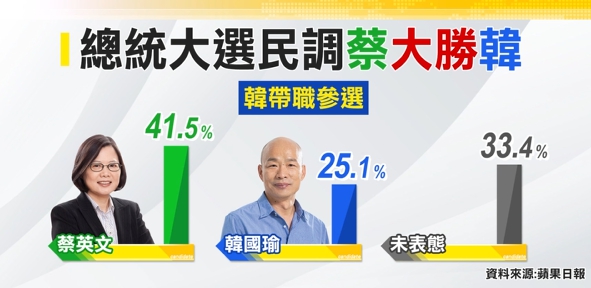 蘋果日報最新民調,蔡總統大幅領先韓國瑜16個百分點,就算韓國瑜辭掉市長,照樣落後13個百分點。