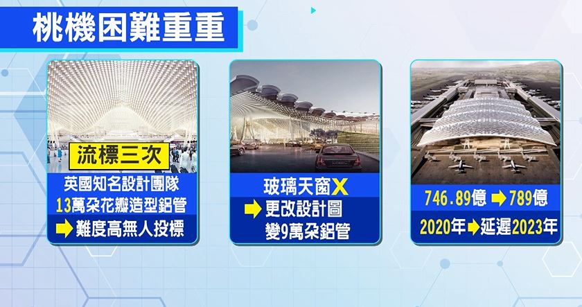 畢竟第三航廈是台灣10大建設後,最重要的單一公共建築,不過2015年由英國知名設計團隊得標,本來屋頂設計成波浪,試想融入台灣建築特色,但工程困難3度流標,改設計圖變單面向,13萬朵的花瓣造型鋁管也要改成9萬朵,還面臨預算爆表,從746億提高到789億,就連完工進度,原定明年也只能延遲到2023年。