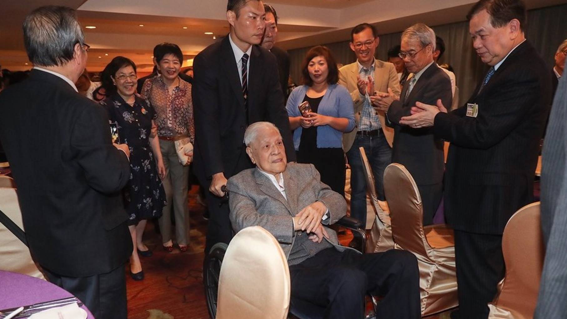 李登輝晚間出席李登輝基金會2019年募款餐會,他雖坐著輪椅但精神不錯,並逐桌向與會者握手致意,停留約20分鐘後離開,久未露面的李登輝一現身會場,媒體、支持者拿起相機、手機閃光燈閃不停。
