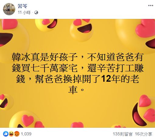 不過,苦苓提出的10點問題,並未收到韓國瑜回應,因此他昨(9日)又在臉書開砲,狠酸:「韓冰真是好孩子,不知道爸爸有錢買7千萬豪宅,還辛苦打工賺錢,幫爸爸換掉開了12年的老車。」原來,韓國瑜先前曾透露,女兒韓冰因為擔心他的交通安全,特地拿出打工的錢,貸款幫他換掉12年的老座車,但當時就被網友批評:「有錢人在裝窮」、「能出國讀書買不起車」、「韓國瑜窮到買不起一台車?」
