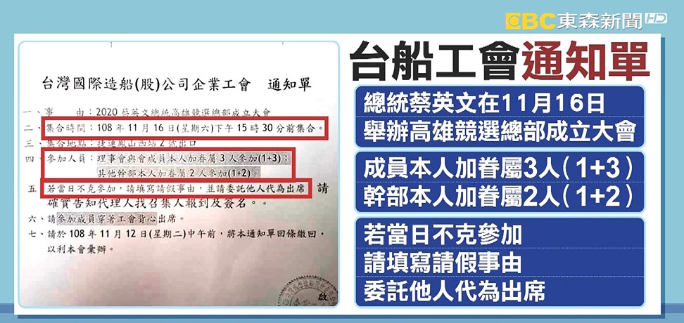 距離2020總統大選只剩下2個多月,藍綠競爭越來越激烈,有就網友PO出台船工會通知單,載明要大家參加總統蔡英文月中高雄競選總部成立大會,不但要求理事會成員本人,還要再多帶眷屬一同參與,如果沒辦法參加還得寫請假事由找代理人出席,網友批評這不叫動員什麼才是動員,對此台船工會回應從來不分藍綠,只要誰對勞工有利就支持誰。