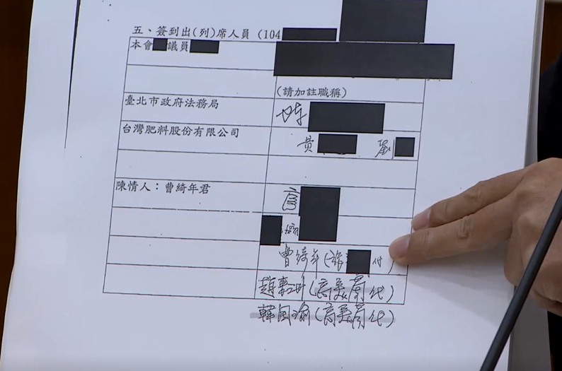 林俊憲拿出協調會的公文,只見公文上除了出席的兩位不知名議員,還有代表韓國瑜出席的高美蘭,除了第一場主張催繳令無效,第二場就是要求台肥借款,只是根據法規,台肥借款除了只能借短期,還得經過董事會同意,但2015起台肥陸陸續續借出13億,卻沒有紀錄,也沒有送董事會討論。