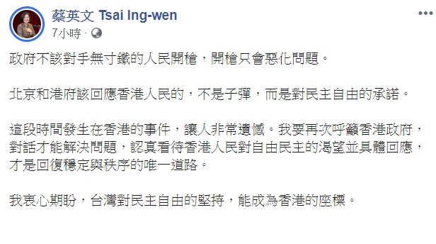 蔡總統透過臉書表示,這段時間發生在香港的事件,讓人非常遺憾。她要再次呼籲香港政府,對話才能解決問題,認真看待香港人民對自由民主的渴望並具體回應,才是回復穩定與秩序的唯一道路。
