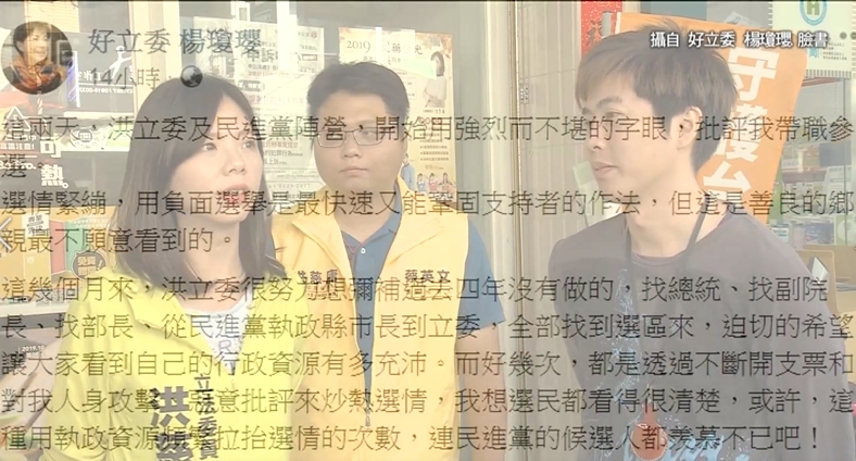 無黨籍立委洪慈庸:「副市長帶職參選,我想網友跟我們選民會有很多質疑,您帶職參選會不會跟過去一樣,濫用公家資源替自己輔選,我想最好的方式就是,楊副市長立即辭去副市長職務,正式投入選舉。」