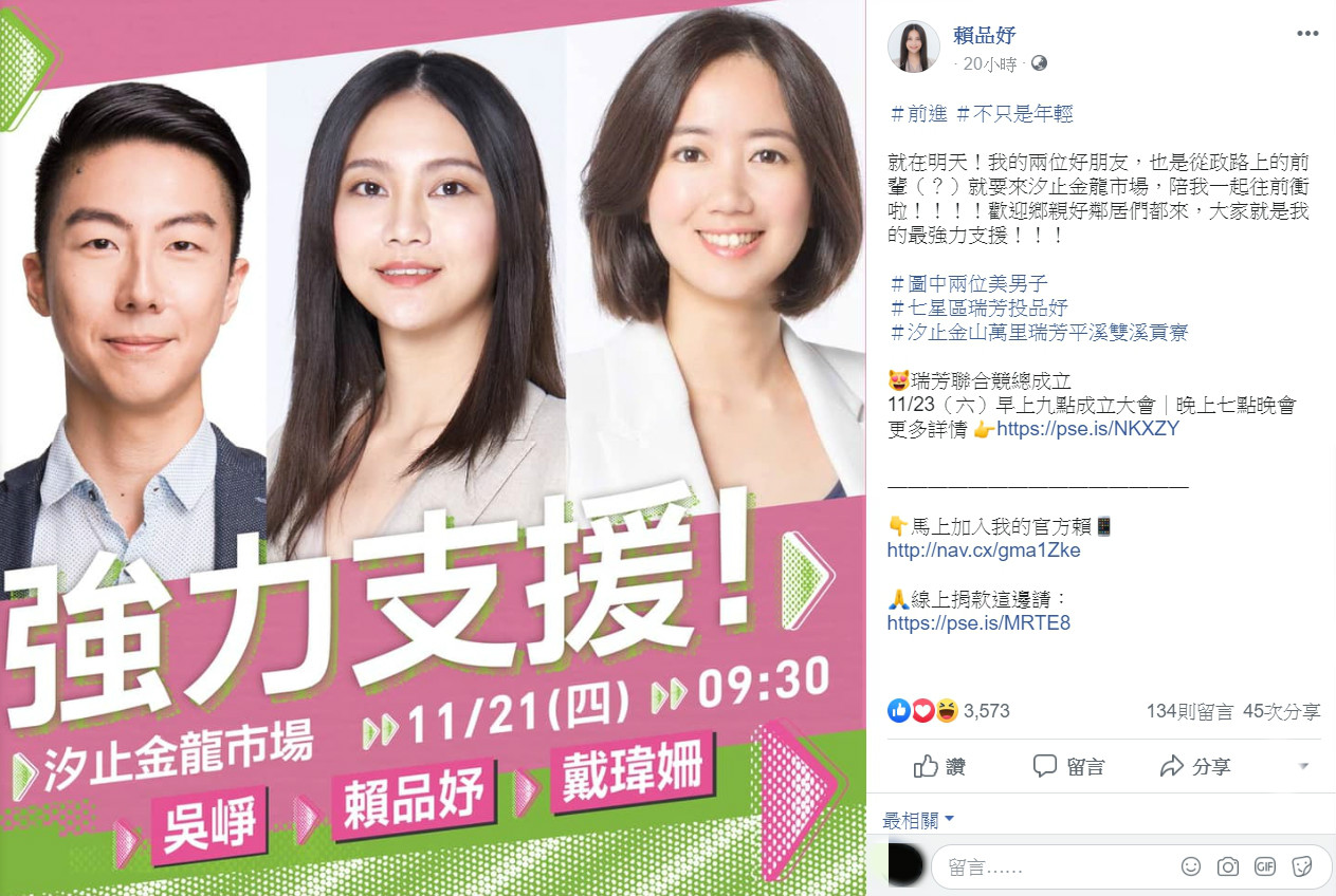 戴瑋姍則指出,賴品妤是相當有衝勁、有理想的年輕女性,社會應該多給女性機會,而且她過去在社會運動,以及對台灣民主的努力,是青年世代參政,最有指標意義的參選人,希望大家可以給年輕人機會進入國會。
