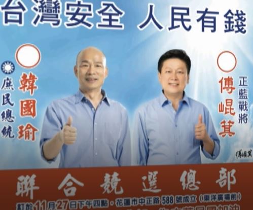黃啟嘉的競選總部,掛上大大的韓國瑜合照,彷彿要宣示自己才是「正藍軍」,但翻開地方報紙頭版,傅崐萁宣布,27日跟韓國瑜的競選總部即將成立,此舉讓國民黨提名的黃啟嘉,心裡很不是滋味。