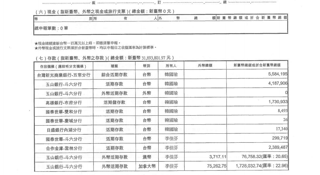 中選會公布最新的公職候選人財產申報,國民黨總統候選人韓國瑜雖然日前深陷豪宅風波,不過在公開的財報中夫妻倆名下都無房產,存款則為3189萬3801元,比起3月的財產申報,多了82萬9,763元。