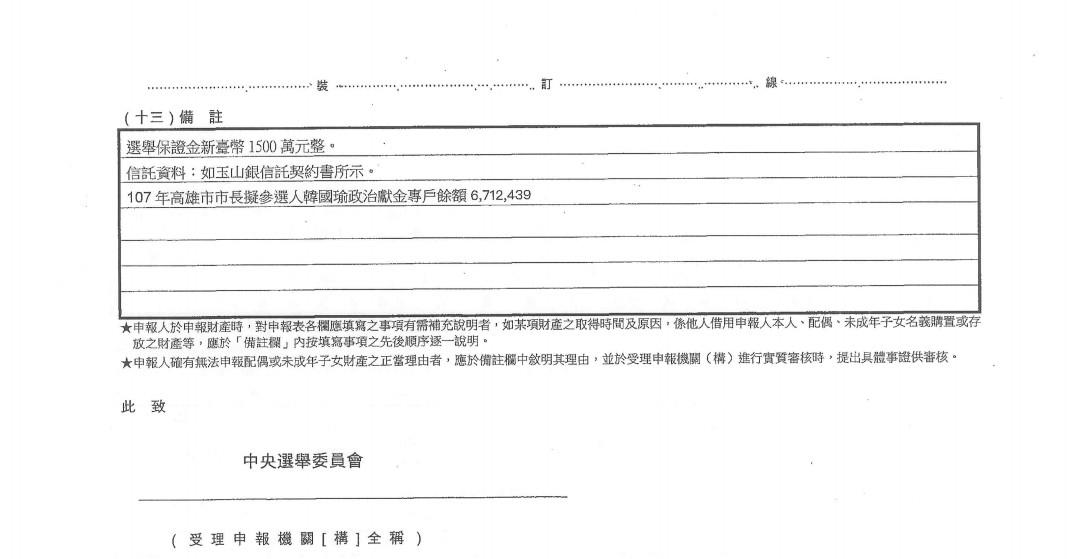 比較3月時的財產申報,當時韓國瑜資產達6466萬9914元,現在含1500萬元選舉保證金及政治獻金則是6549萬9677元。8個月資產為增82萬9763元。