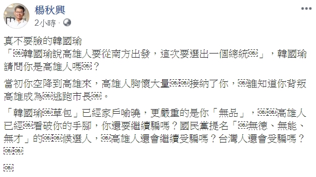 楊秋興今天在臉書FB貼文「真不要臉的韓國瑜」。貼文指出,「韓國瑜說高雄人要從南方出發,這次要選出一個總統」、「韓國瑜請問你是高雄人嗎?」貼文指出,當初韓國瑜空降到高雄,高雄人胸懷大量接納了他,誰知道他背叛高雄成為逃跑市長。